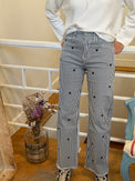 Calças modelo cinco bolsos, às riscas azuis escuras com corações bordados. Perna Direita.