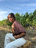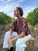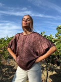 Blusa em tons castanhos com padrão de zebra. Decote redondo e mangas com atilhos. Fecha com pequeno atrás.