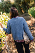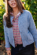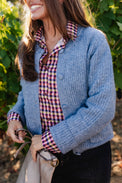 Casaco de malha curto com torcidos pequenos, bolsos chapados, botões forrados e decote redondo.