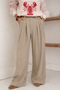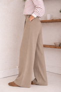 Calças wide leg em cor taupé com pregas. De silhueta fluída, cintura subida e perna ampla, que alonga a figura. As pregas frontais dão estrutura subtil, enquanto o tecido leve, garante movimento.