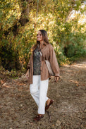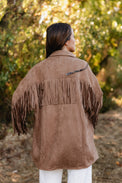 Camisa comprida em pele de pêssego, com franjas à frente, costas e nos braços. Fecha com botões prateados.