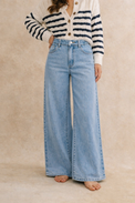 Calças de ganga clara em modelo wide leg, com perna larga e fluída. Cintura média com elástico atrás para melhor conforto e melhor ajuste ao corpo. Na parte de trás, destaque para os bolsos em formato de coração em ganga mais escura, que dão um toque romântico e diferenciador à peça. Fecho frontal com botão metálico, fecho éclair oculto e dois bolsos laterais funcionais.