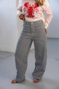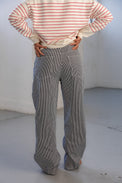 Calças jeans de cintura alta, em sarja de algodão cinza muito claro às riscas verticais azuis escuras. Modelo wide leg, com corte solto na perna.