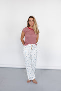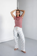 Jeans brancos com bolinhas azuis e botões na frente.