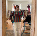 Polo de malha com riscas em cor de tijolo e verde-azulado. Fecha com três botões forrados em malha.