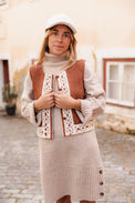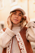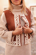 Colete pele de pêssego na cor camel. Detalhes rendados à frente. Aperta com quatro botões.