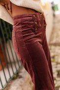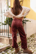 Calças de perna larga, em veludo cotelê rosa-velho. Fecha com botões dourados à frente. Dois bolsos atrás.