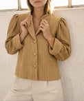 Jaqueta em cor de areia com riscas verticais brancas. Mangas em balão. Com botões forrados.